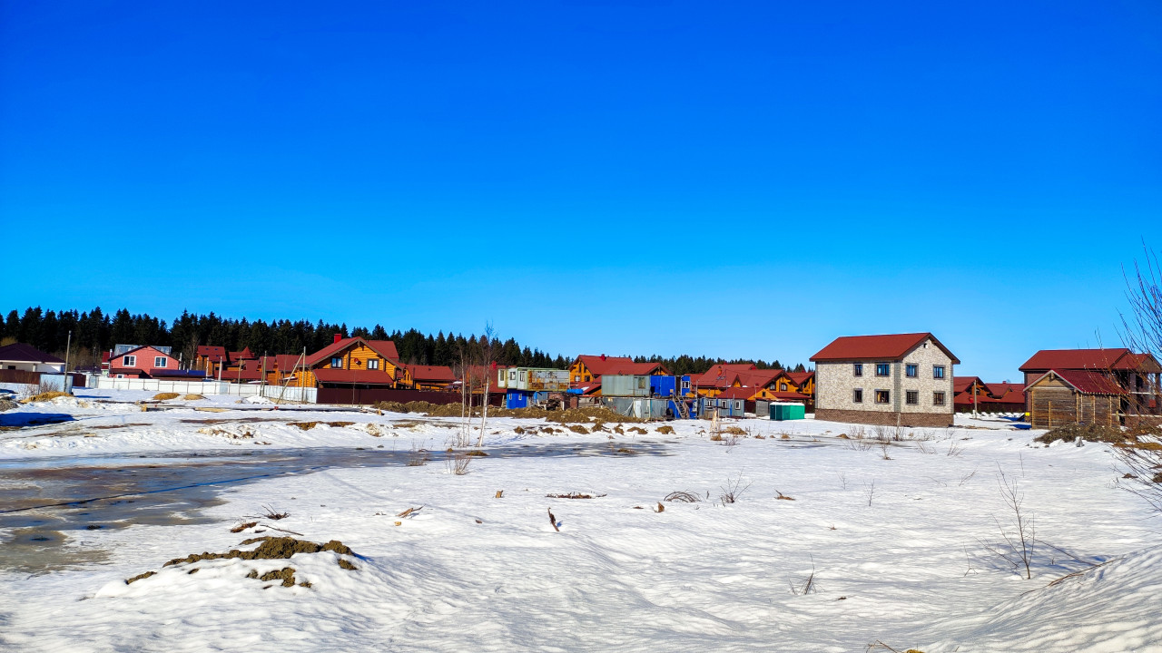 На фото изображена застройка частного сектора в зимний период: одно- и двухэтажные жилые дома с красными кровлями расположены на ровной территории перед линией хвойного леса. На переднем плане заметно открытое поле, покрытое снегом и участками талой воды. Архитектура строений типична для современной коттеджной застройки северных и центральных регионов, без признаков исторических или культурно значимых сооружений. Изображение может применяться в материалах о климате, сезонности, инфраструктуре малых поселений или иллюстрации загородной жизни.