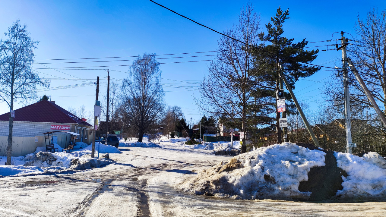 На данном кадре показан перекрёсток в небольшом поселке: рядом расположено одноэтажное здание с вывеской «МАГАЗИН», по обочинам сохраняются зимние сугробы, а над дорогой проходят линии электропередачи, закреплённые на нескольких опорах. Деревья без листвы указывают на холодный сезон, а наличие автомобилей подчёркивает жилой характер улицы. Кадр фиксирует инфраструктурные элементы, характерные для сельских и дачных территорий. Снимок подходит для публикаций о районной торговой инфраструктуре и малых населённых пунктах.