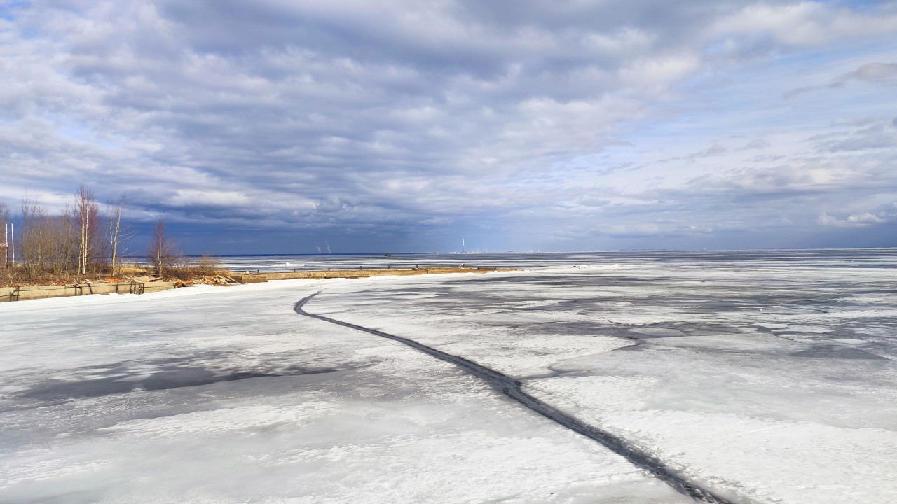 На фотографии запечатлено побережье Финского залива в период весеннего ледохода. По льду проходит темная трещина, ведущая к открытому горизонту, где виднеются очертания промышленных труб и Лахта-центра — самого высокого здания России, построенного в 2019 году в Санкт-Петербурге. На переднем плане остатки деревянных настилов и кустарников вдоль берега. Сцена отражает переходное состояние природы между зимой и весной. Фото может использоваться для иллюстраций о климате, экологии, сезонных изменениях.