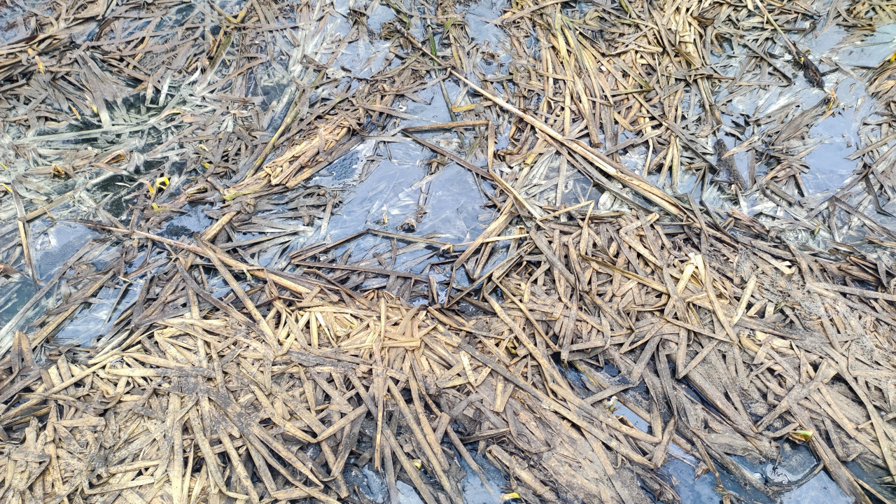 На фото показано болотистое пространство с талыми водами, покрытое прошлогодними стеблями растений. Между ними видны ледяные участки и небольшие скопления снега. Лес на заднем плане состоит из елей и берёз, характерных для северных областей России. Снимок отражает переход от зимы к весне и начало активного таяния. Используется для иллюстрации тем экологии, климата, природных процессов и сезонных изменений.
