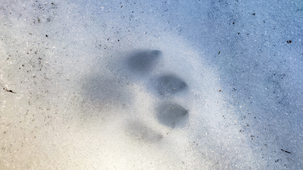 На фотографии крупным планом показан отпечаток собачьей лапы на уплотнённом и подтаявшем снежном покрове. Судя по размеру и форме подушечек, след принадлежит домашней собаке, проходившей по участку в зимний период. Снег имеет зернистую структуру, что говорит о перепадах температуры и оттепели. Рядом видны мелкие частицы мусора и природного мусора, типичные для открытой местности. Исторически значимых или культурных объектов изображение не содержит. Снимок может использоваться в материалах о зимней экологии, поведении собак на прогулке, наблюдении за следами животных и иллюстрациях для тематики дикой и домашней фауны.
