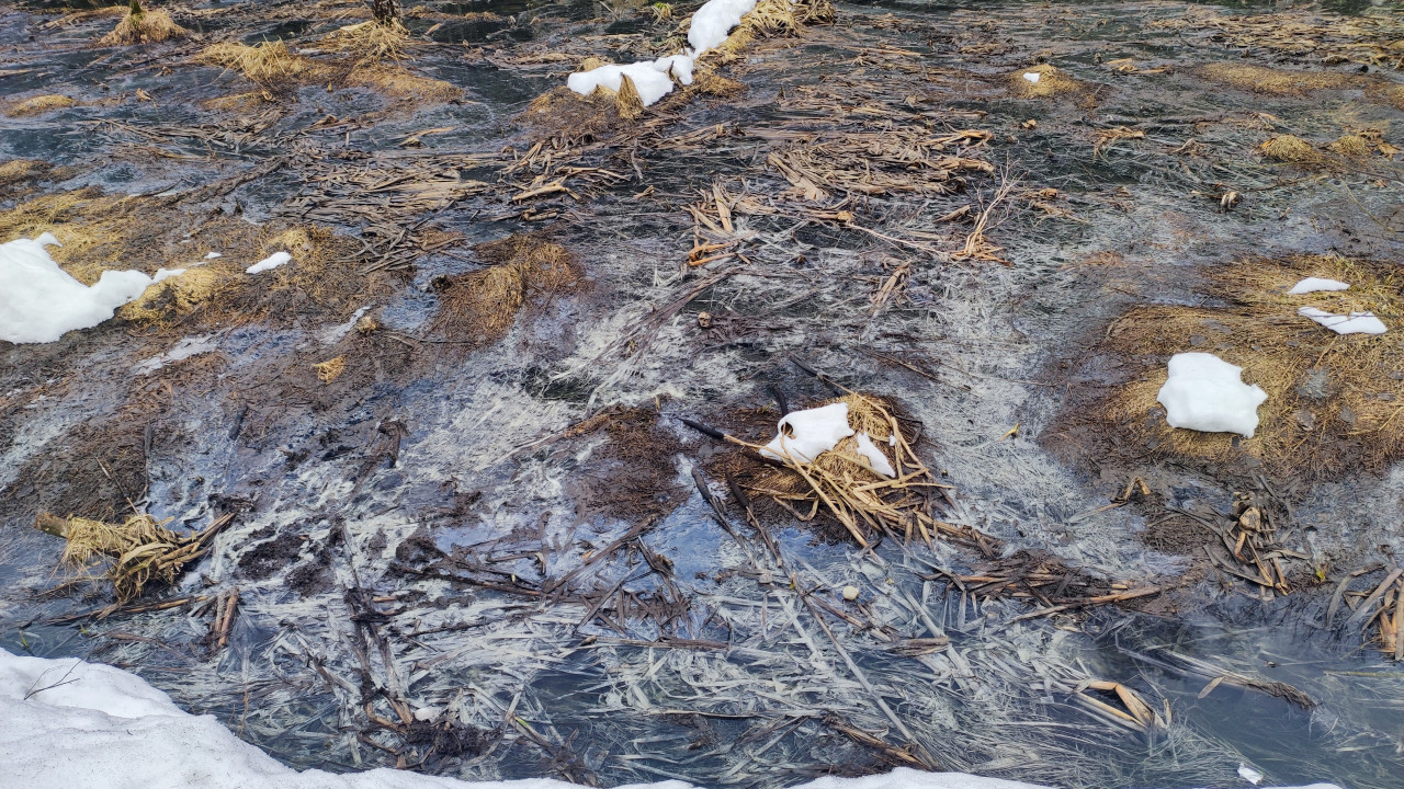 На снимке видна поверхность подтаявшего болота, частично покрытая остатками травы, коричневым грунтом и тонким льдом. Снежные пятна на переднем плане чередуются с участками открытой земли. Тонкие ледяные трещины указывают на процесс весеннего оттаивания. Сцена характерна для переходного периода между зимой и весной в северных районах России. Фотография подходит для использования в материалах о природных процессах, экологии и сезонных изменениях климата.