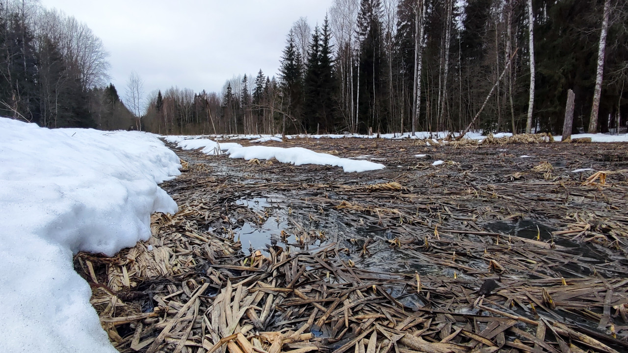 Фотография запечатлела заболоченный участок леса с остатками снега и слоями сухого тростника. На поверхности воды видны участки льда и молодые ростки, пробивающиеся через прошлогодние стебли. Слева кадра тянется снежная полоса, а вдали различимы хвойные и лиственные деревья. Небо затянуто облаками, что создает ощущение холодной ранней весны. Сцена типична для северных регионов Европы и России и может использоваться в образовательных, экологических и природоведческих публикациях.