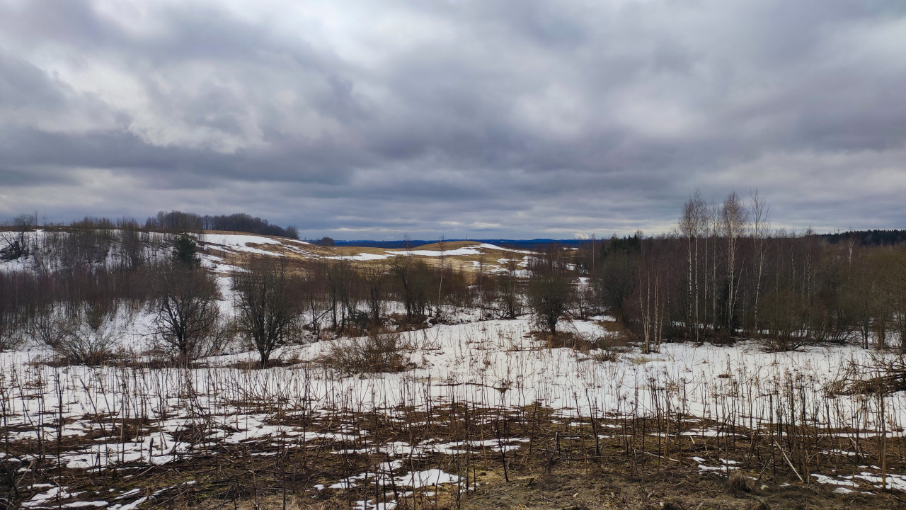 Фотография запечатлела сельский ландшафт с холмами, частично покрытыми снегом, и группами голых деревьев. На переднем плане видны сухие стебли растений, а вдали — лесной горизонт под серыми облаками. Местность напоминает заброшенные сельхозугодья в период перехода от зимы к весне. Изображение передаёт атмосферу затишья и сезонных изменений, подходит для экологических и географических публикаций, а также как иллюстрация природы средней полосы.