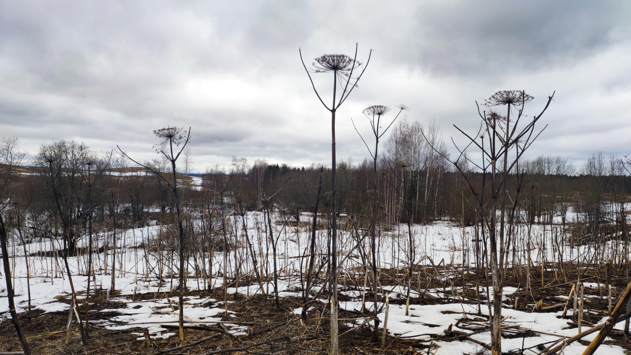 борщевик зима поле инвазивное растение сорняк экология ботаника природа север снег сухие стебли сельская местность Россия Прибалтика сухие растения стебли деревья лес холмы облака пасмурно опасные растения сельский пейзаж февраль март весна таяние снега заброшенные поля охрана природы борьба с сорняками растения зимой пустырь климатПохожие фотографии