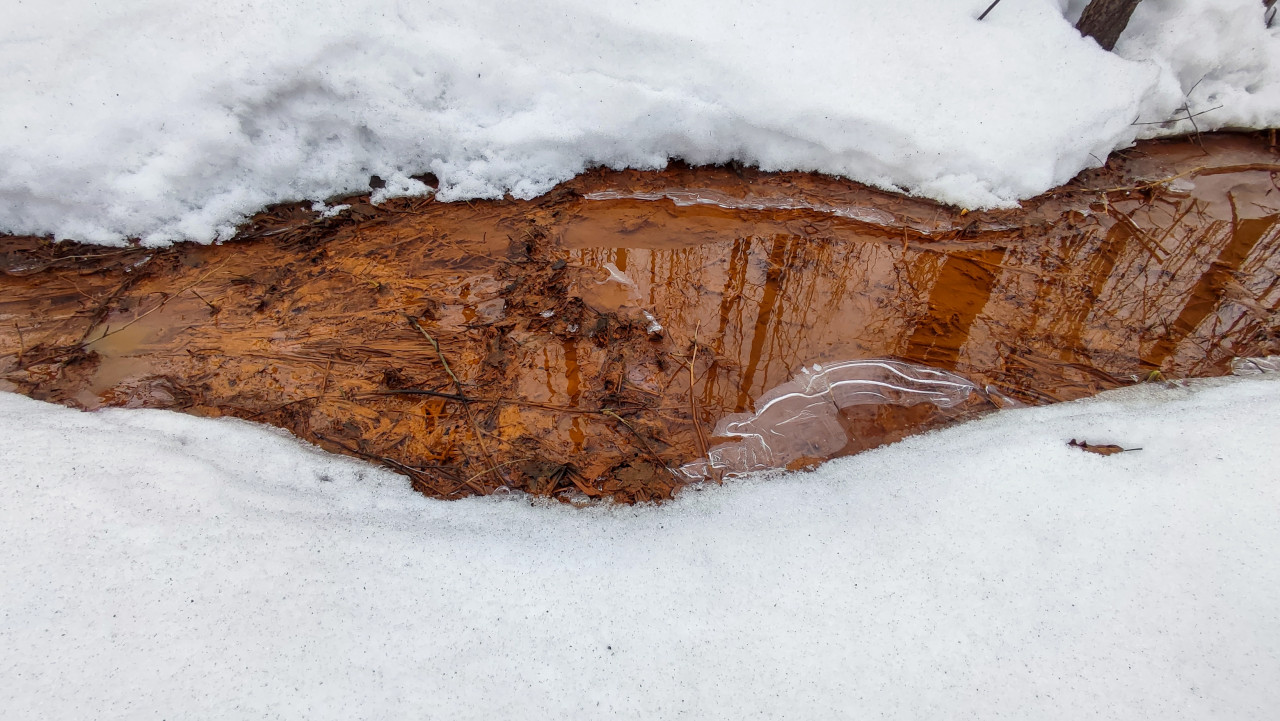 На фотографии изображён неглубокий ручей с рыжевато-коричневой водой, текущий под слоем снега. В воде отражаются стволы деревьев, стоящих вдоль русла. На поверхности заметны тонкие ледяные корки и следы таяния. Сюжет передаёт переходное состояние между зимой и весной в лесной зоне России. Фото можно использовать для иллюстрации природных явлений, учебных материалов по гидрологии и климату, а также экологических публикаций.