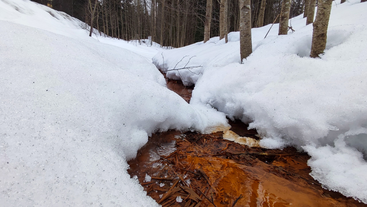 Фотография изображает небольшой ручей, текущий среди глубоких снежных сугробов. Вода имеет коричневато-рыжий оттенок, насыщена частицами почвы и растительными остатками. На поверхности виден тонкий слой льда, а по краям — рыхлый снег с кристаллической структурой. На заднем плане — стволы деревьев в зимнем лесу. Снимок иллюстрирует процесс таяния снега в естественных условиях и подходит для публикаций по темам гидрологии, экологии и природы России.