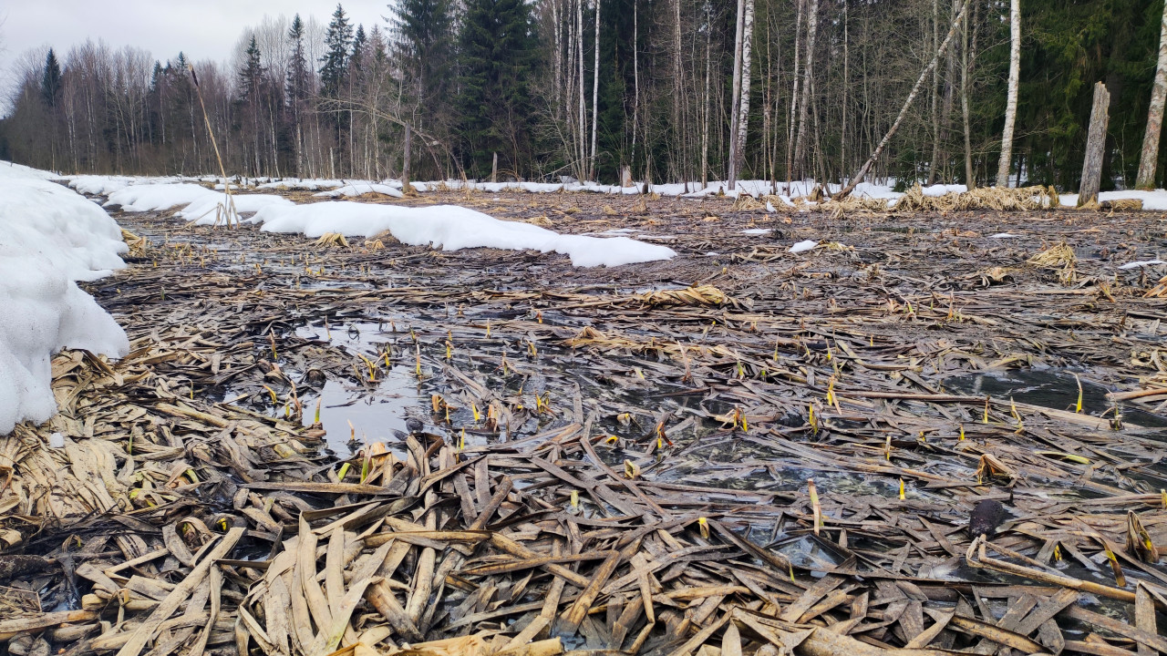 На фотографии изображен участок болотистой местности на границе леса. Поверхность покрыта слоем прошлогодней растительности и талым снегом. Вода отражает серое небо, а из-под старых стеблей появляются зеленые ростки. На горизонте виден смешанный лес, где преобладают березы и ели. Снимок демонстрирует естественные процессы пробуждения природы после зимы. Фотография подходит для использования в экологических публикациях, учебных материалах и визуальных проектах о сезонных изменениях климата.