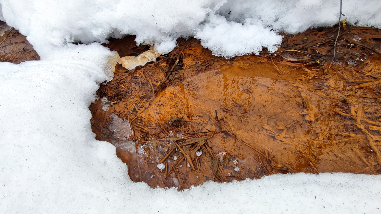 Талый ручей с рыжеватой водой среди снежных сугробов