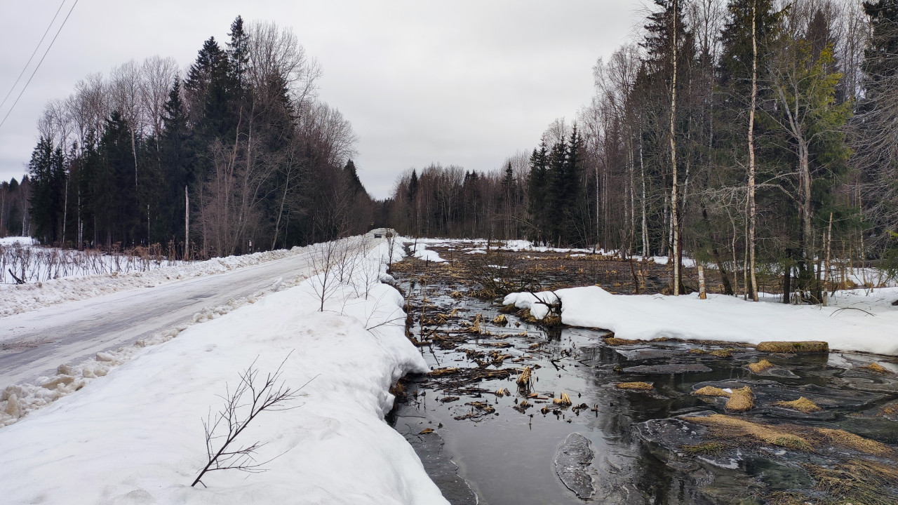 На фото изображена загородная дорога, идущая вдоль болотистой местности. Слева видна заснеженная обочина, справа — участок талого болота с остатками растений и льда. Вдали дорога уходит в лесной массив, где стоят березы и ели. Пасмурное небо и влажная поверхность подчеркивают сезонную оттепель. Снимок отражает типичный весенний пейзаж северных регионов и может использоваться в публикациях о природе, экологии и транспортных особенностях сельских территорий.