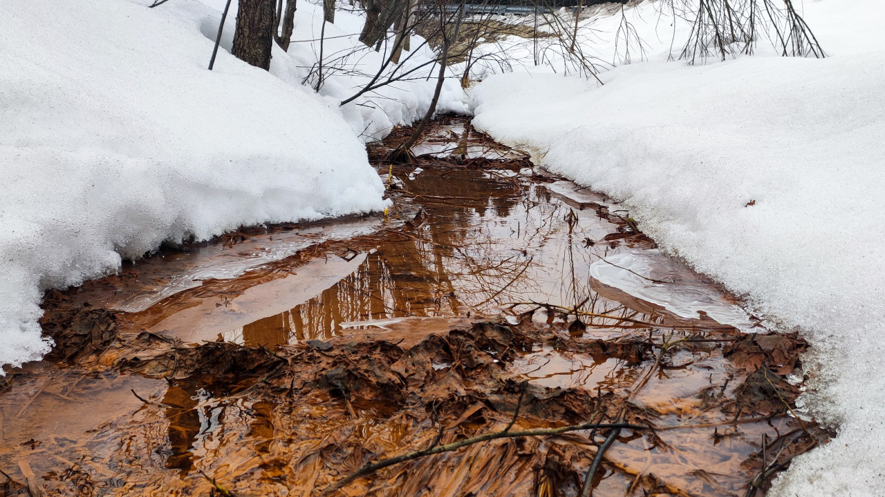 Фотография показывает узкий ручей, текущий среди заснеженных склонов леса. Вода имеет рыжеватый оттенок, насыщенный органическими веществами и частицами почвы. Вдоль русла видны деревья с тонкими ветвями, склоняющимися над водой. Снег по краям плотный и влажный, с неровной структурой. Кадр иллюстрирует естественный процесс весеннего снеготаяния, характерный для северных и центральных регионов России. Фото можно использовать в образовательных и экологических проектах.