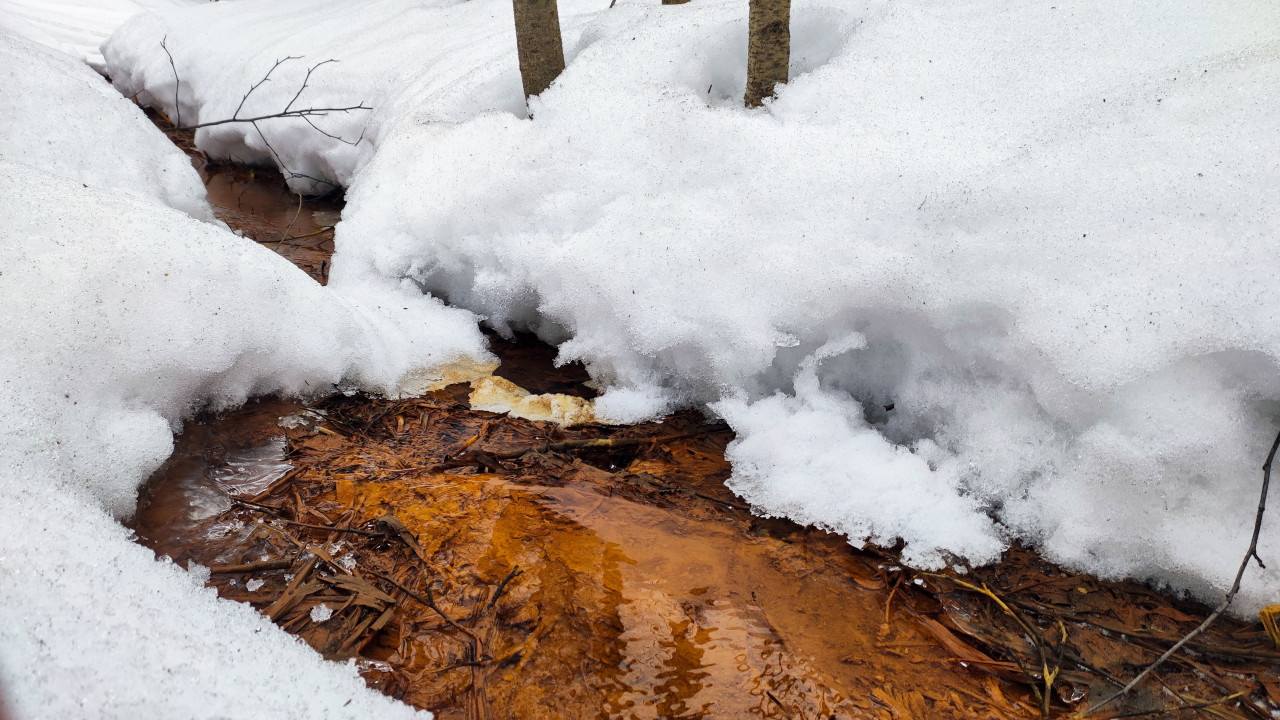 На фотографии изображён узкий ручей, пробивающийся сквозь плотный снежный покров. Вода бурого цвета насыщена органическими веществами, а вдоль русла видны стволы молодых деревьев. Снег на берегах рыхлый, местами подтаявший, с ледяными кромками. Кадр передаёт процесс весеннего снеготаяния, характерный для лесных районов средней полосы России. Снимок может использоваться в научно-просветительских и экологических проектах.