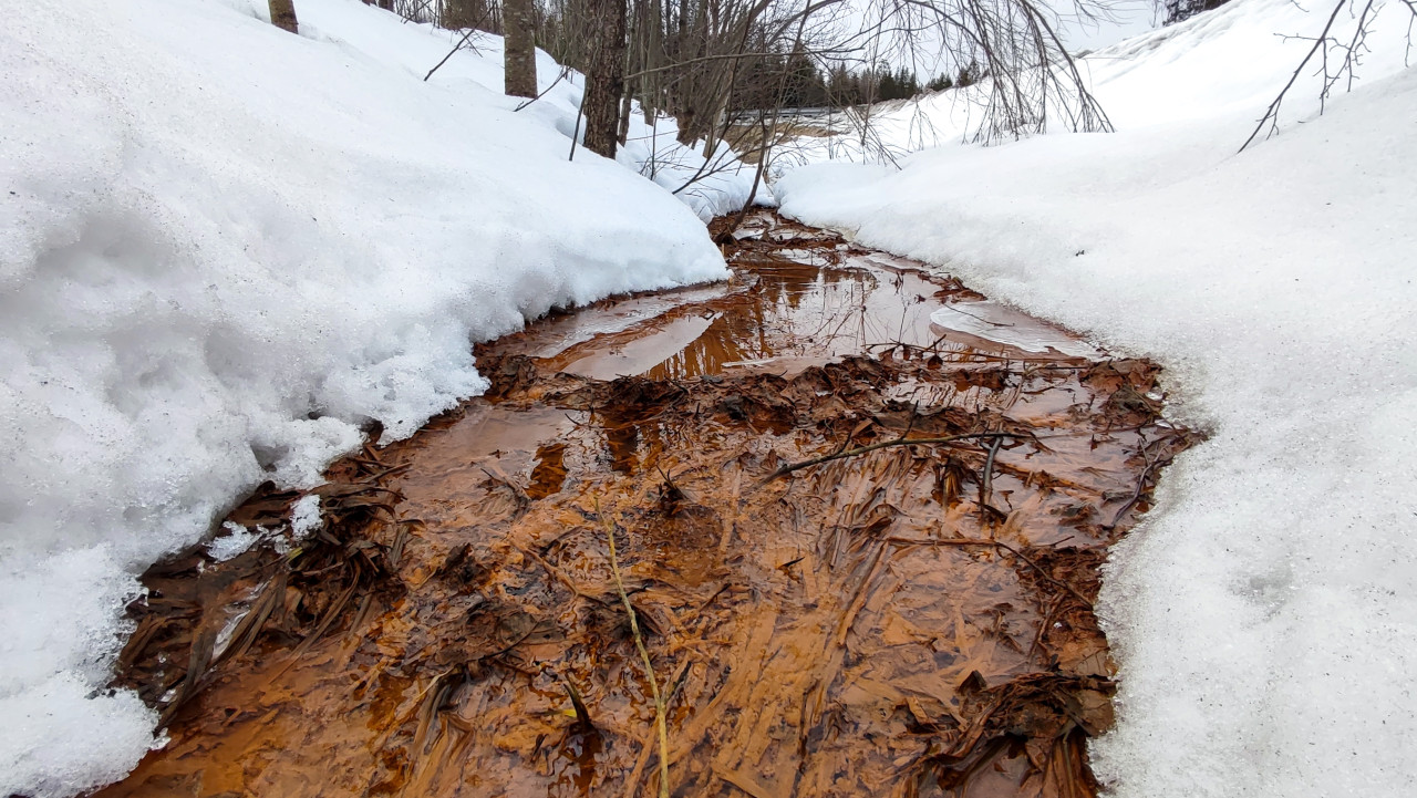 На снимке изображён ручей, протекающий среди сугробов в лесной зоне. Вода имеет насыщенный коричневато-рыжий оттенок из-за примесей органики и глины. На дне видны листья и ветки, а по берегам — плотный, частично подтаявший снег. Вода отражает деревья и небо, что указывает на начало весеннего периода. Фотография может использоваться для иллюстрации природных процессов, сезонных явлений и климатических особенностей России.