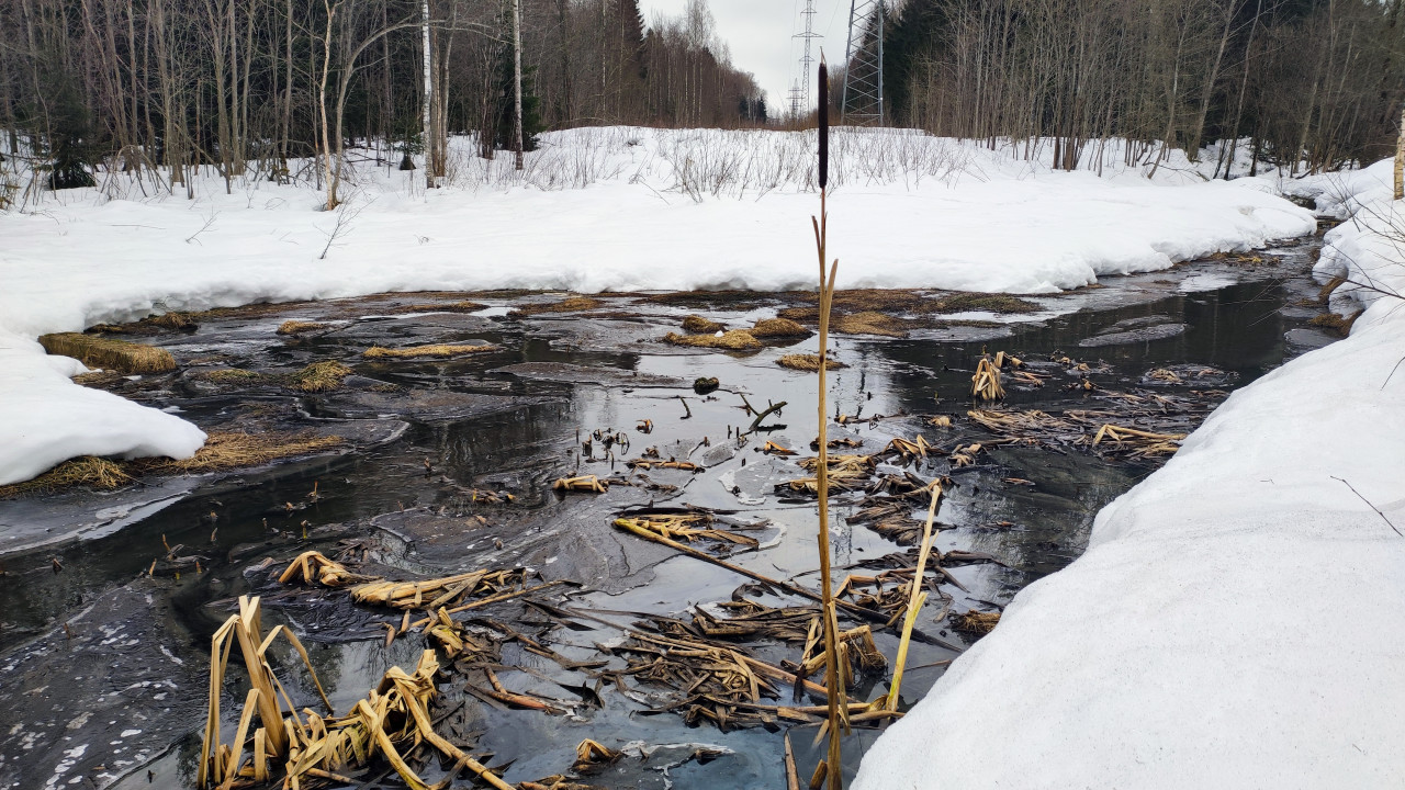 На фото представлен участок болота, где талая вода образует ручей среди остатков прошлогодних растений. На поверхности воды видны куски льда и сухие стебли камыша. По краям кадра лежат снежные сугробы, а за ними начинается лес с березами и елями. В небе плотные облака, создающие равномерный свет. Сцена характерна для весеннего периода северных регионов и может быть использована в экологических, природоведческих и климатических проектах.