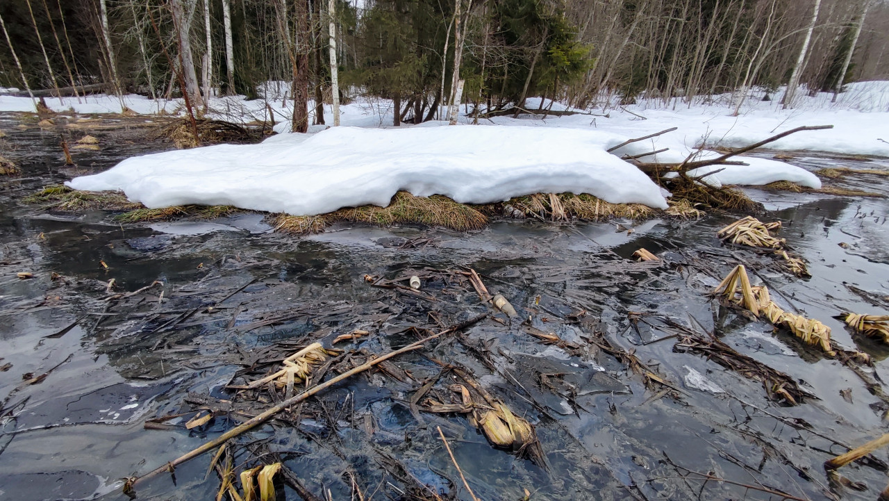 На фото изображён заболоченный участок леса в период весеннего таяния. Вода покрыта фрагментами льда, на поверхности лежат остатки сухих стеблей и травы. На заднем плане виднеются березы и ели, стоящие по краю леса. По снегу и характеру растительности можно судить, что снимок сделан в северном или центральном регионе России. Этот кадр подходит для тематических публикаций о природных экосистемах и процессах сезонного изменения климата.