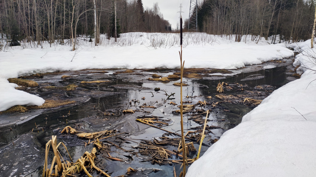На фотографии изображён ручей в тающем снегу, окружённый болотной растительностью. Вода частично покрыта льдом, на поверхности заметны стебли прошлогоднего тростника и камыша. По краям кадра лежат плотные снежные сугробы, а вдали виднеется лесная опушка с березами и хвойными деревьями. Освещение рассеянное, пасмурное, типичное для северной весны. Снимок подходит для материалов о природных процессах, экологии и сезонных изменениях в умеренных широтах.