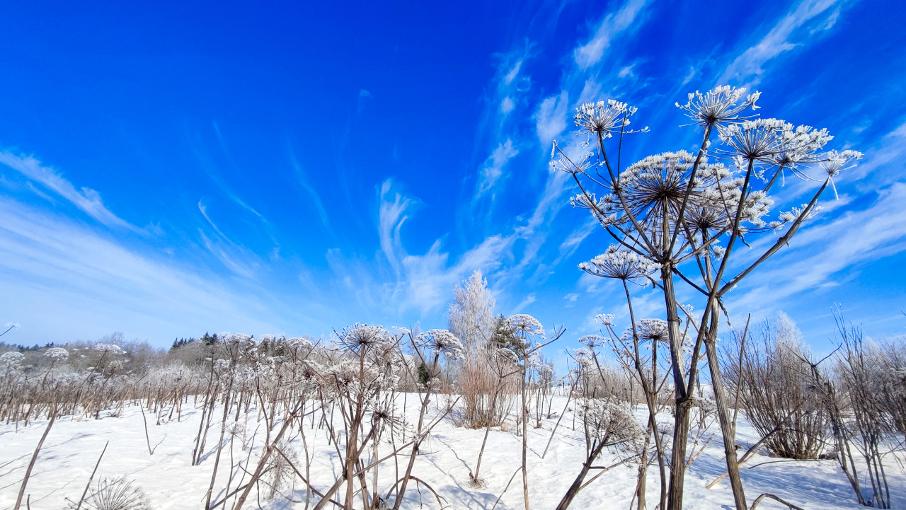 зима иней мороз снег растения поле природа север флора ботаника холод облака небо пейзаж борщевик зонтики деревья кустарники сезон декабрь январь февраль чистый воздух морозное утро фон климат растительность снежное покрытие природный пейзажПохожие фотографии