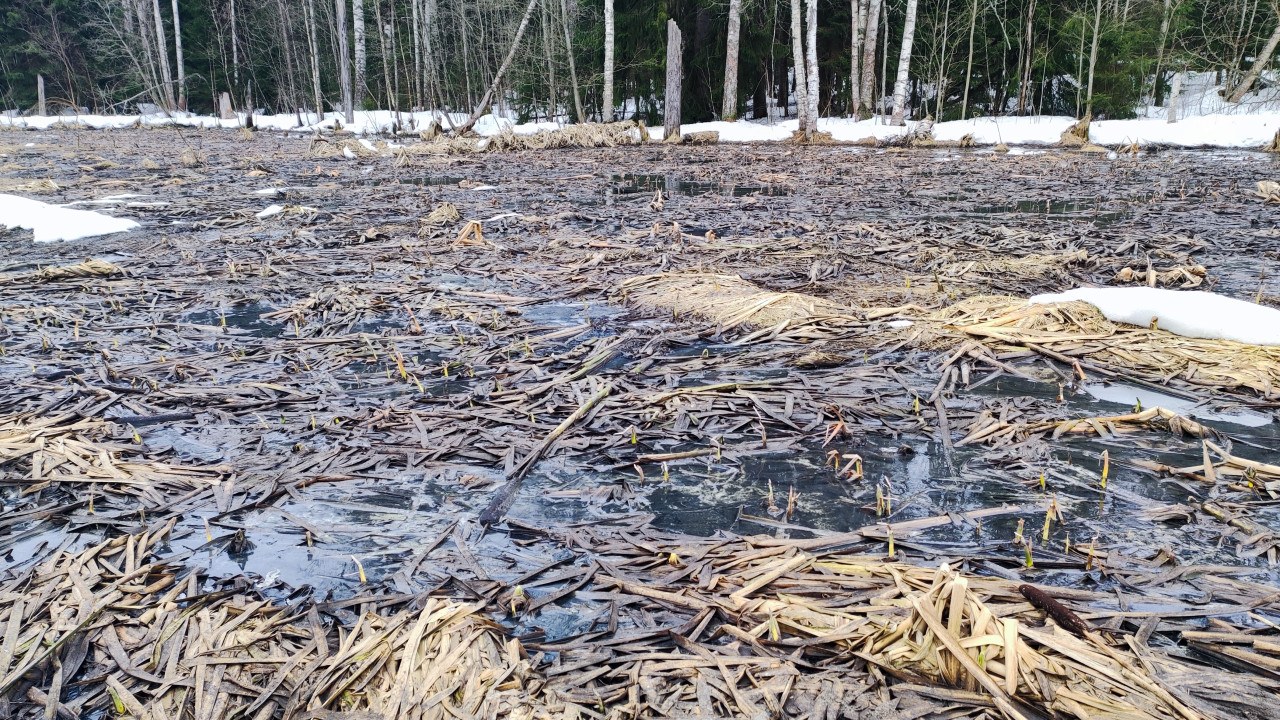 Снимок показывает заболоченный участок леса, где талая вода залила траву и растительные остатки. По поверхности воды плавают прошлогодние стебли камыша и тростника, а вокруг ещё лежат снежные сугробы. На заднем плане виден смешанный лес с берёзами и хвойными деревьями. Такая картина характерна для северных регионов в период весеннего паводка, когда снег активно тает, наполняя низины влагой. Фото можно использовать в экологических публикациях, учебных материалах и иллюстрациях сезонных процессов.