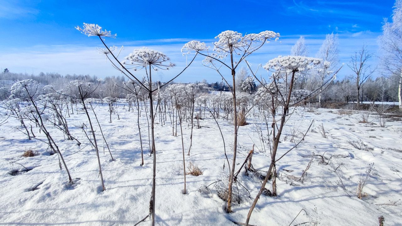 На изображении показано поле борщевика, усеянное заснеженными стеблями и соцветиями. Деревья на горизонте покрыты инеем, небо чистое и насыщенно-синее. Светлое зимнее освещение делает картину контрастной и четкой. Фотография подходит для использования в публикациях о природных явлениях, сезонных изменениях и экологических темах.