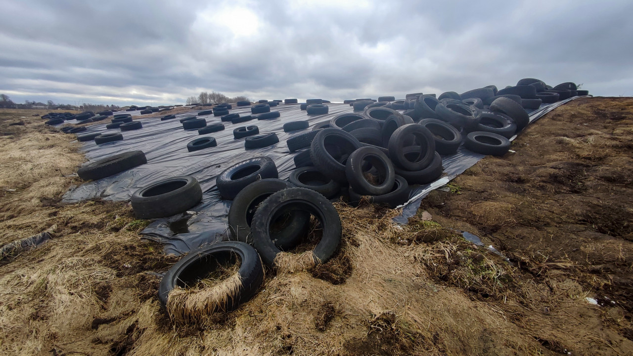 Силосная яма на поле, укрытая чёрной плёнкой и шинами