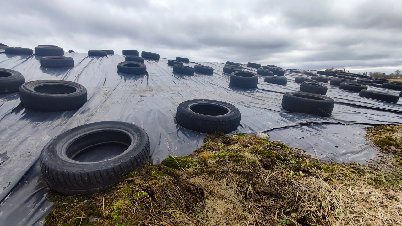 Укрытое силосное хранилище с тракторной шиной на переднем плане