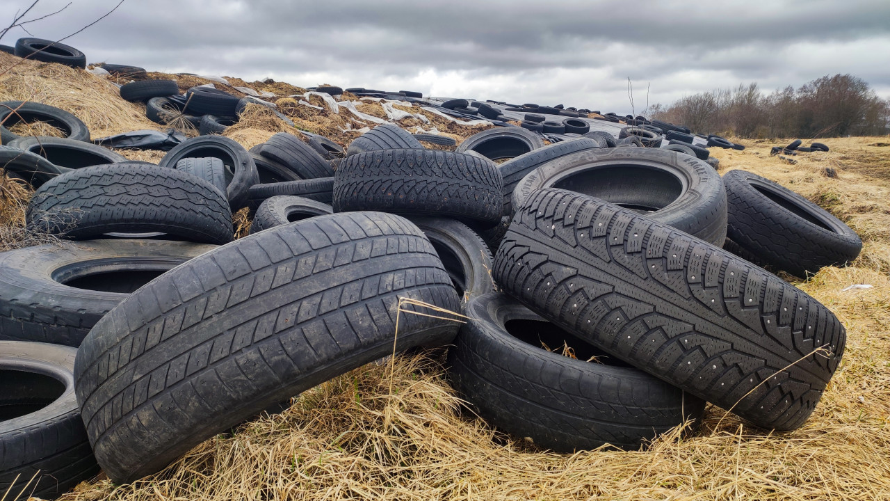 Крупный план показывает множество автомобильных шин, разложенных на укрытом чёрной плёнкой силосе. Шины различного типа, включая зимние с шипами, применяются как утяжелители для фиксации полиэтилена, предотвращая попадание воздуха внутрь хранилища. Поверхность вокруг покрыта сухой травой, небо затянуто облаками. Сцена иллюстрирует практику вторичного использования автопокрышек в сельском хозяйстве. Фото подходит для тем о переработке отходов, агротехнологиях и экологии.