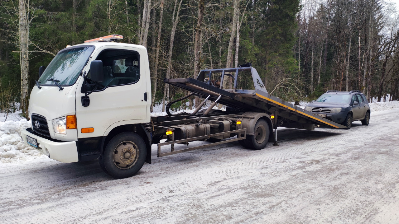 Эвакуация внедорожника Renault Duster на заснеженной трассе в лесу
