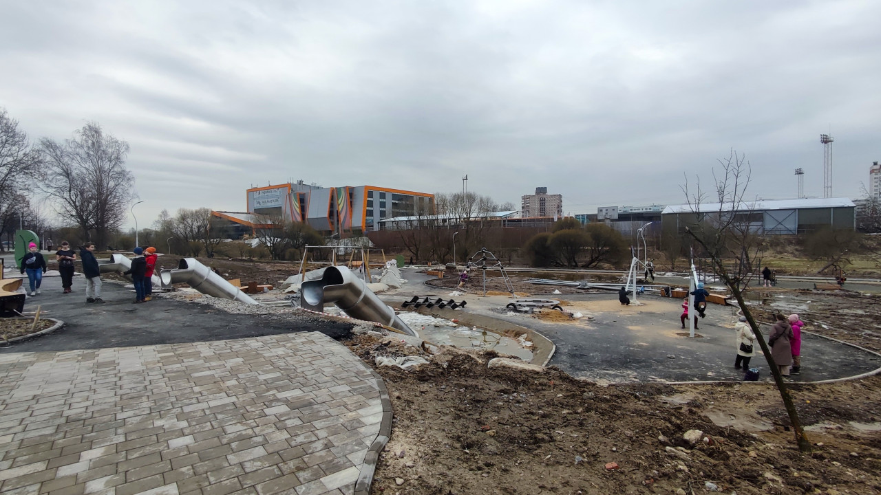 Сцена показывает процесс благоустройства новой детской площадки с металлическими горками, качелями и игровыми элементами. Вокруг территории видна строительная техника и неутрамбованный грунт. Несколько семей с детьми гуляют по ещё не завершённой зоне отдыха. На фоне заметен современный торговый центр с оранжево-серыми панелями фасада и жилые здания. Кадр отражает этап модернизации городской инфраструктуры и подходит для публикаций о градостроительных проектах.