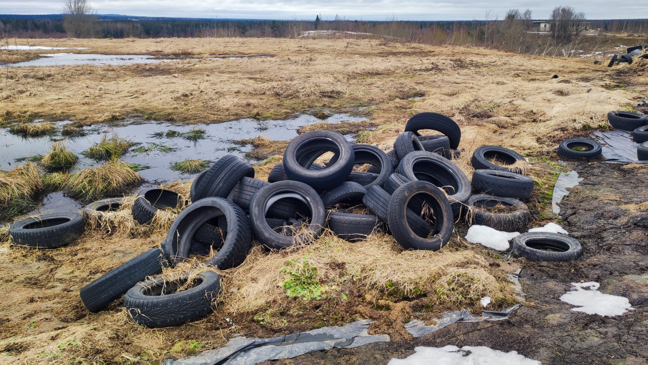 На фото показаны старые автомобильные шины, временно сложенные у края поля рядом с силосным укрытием. Такие шины часто используются для утяжеления полиэтиленовой плёнки при силосовании кормов, предотвращая попадание воздуха. На заднем плане видны талая вода и остатки снега. Изображение можно применять в темах сельского хозяйства, утилизации и повторного использования материалов.