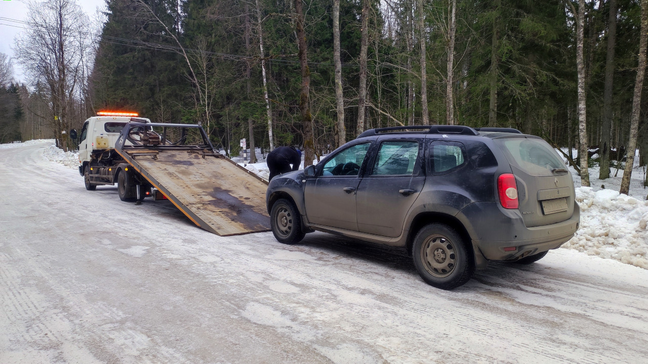 Зимняя эвакуация автомобиля Renault Duster на обледенелой трассе