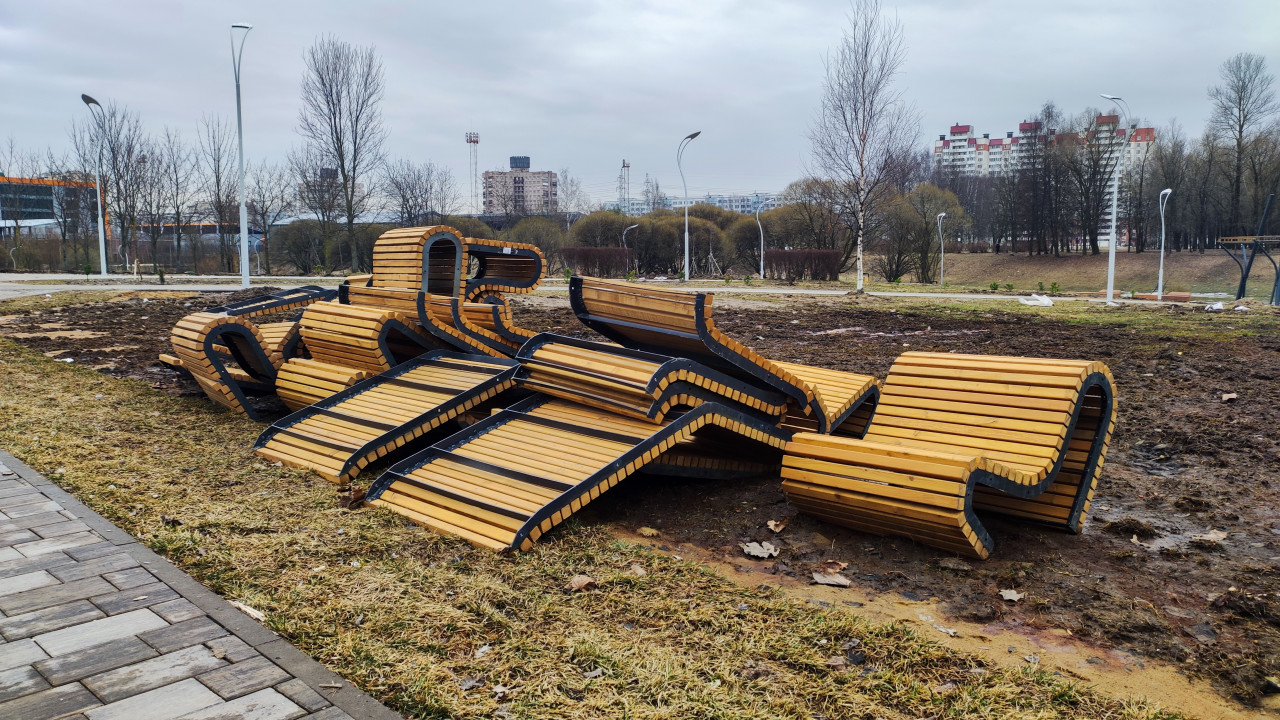 На фото изображены современные уличные скамейки волнообразной формы, выполненные из деревянных реек с металлическим основанием. Они сложены на газоне, ожидая монтажа. На заднем плане виден парк с молодыми деревьями, тропинками и фонарями, а также здания жилого района. Сцена снята в пасмурный день ранней весной. Снимок можно использовать в темах благоустройства, городской мебели и общественных пространств.