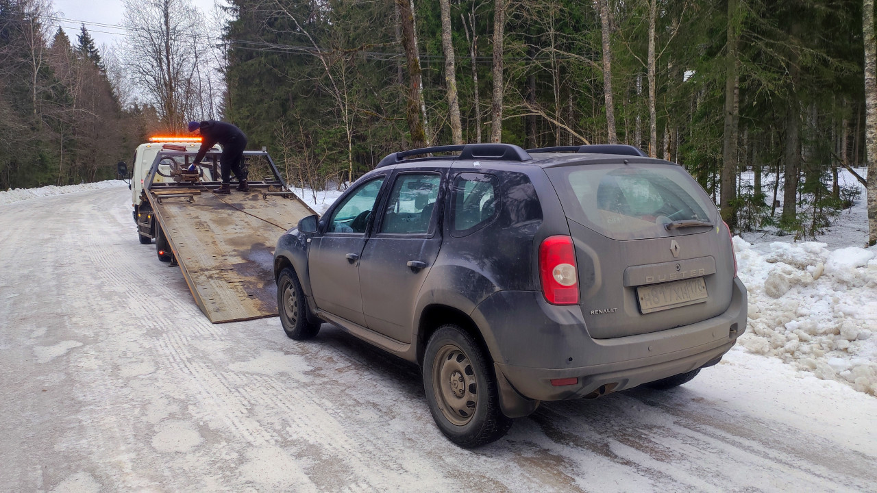 Внедорожник Renault Duster перевозится на эвакуаторе зимой