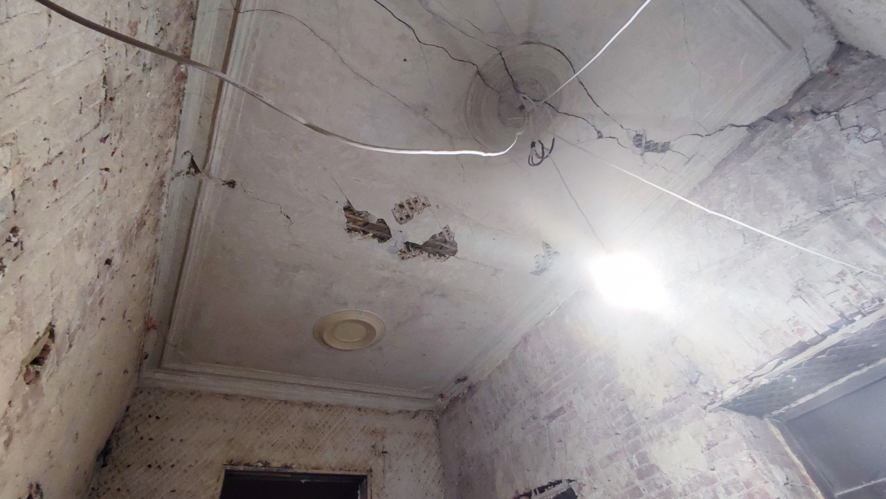 На изображении представлен потолок старого здания с лепным декором и значительными повреждениями штукатурки. Видны трещины, обрушенные участки и проводка временного освещения. Снимок сделан в процессе реставрационных работ, когда объект готовят к укреплению перекрытий. Подобные кадры подходят для статей о реконструкции исторической архитектуры и инженерных обследованиях зданий.