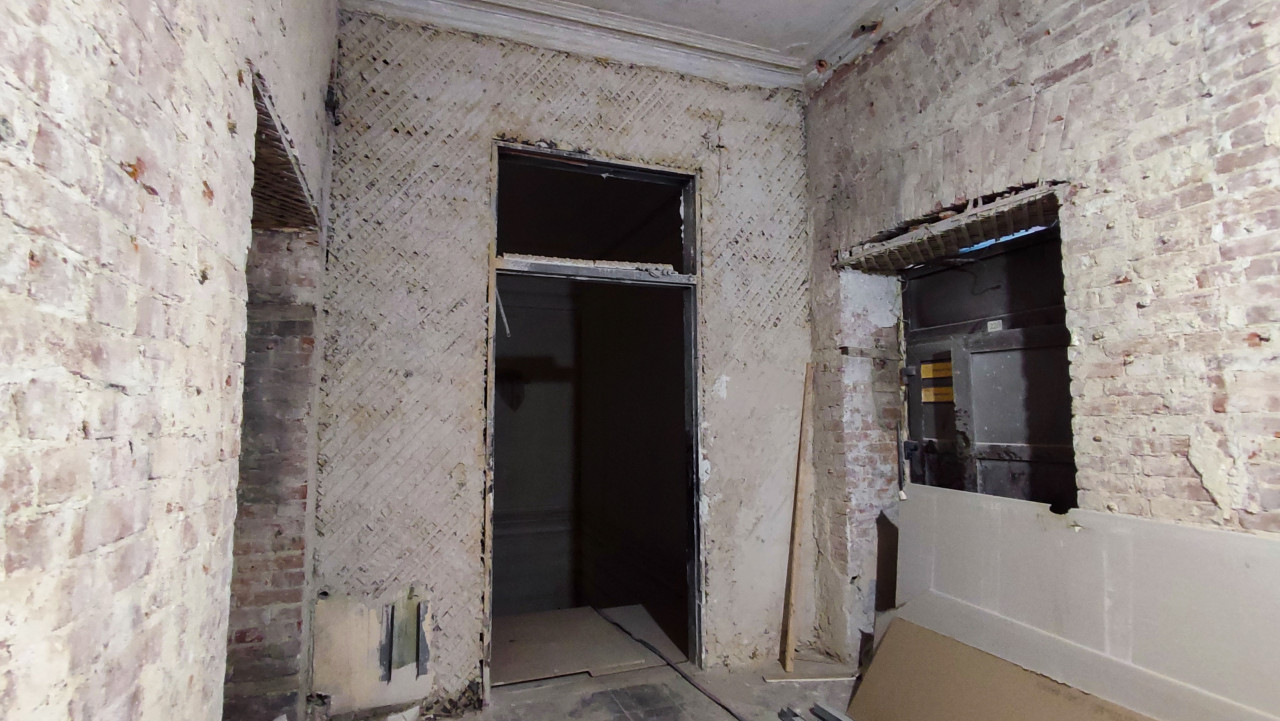 На снимке изображён фрагмент помещения с обнажёнными кирпичными стенами и проёмами, находящегося в стадии восстановления. Видны следы штукатурки и деревянные планки старой конструкции. Строительные инструменты и панели указывают на текущие ремонтные работы. Такое изображение характерно для реконструкции зданий конца XIX — начала XX века, когда восстанавливаются несущие стены и дверные проёмы. Фото подходит для статей о реставрации архитектурных объектов и строительных технологиях.