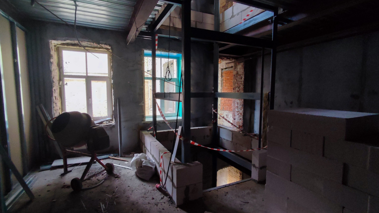 На фотографии показан процесс реконструкции внутреннего помещения старого здания. Видны кирпичные стены без отделки, металлический каркас перекрытия, бетонный пол и строительное оборудование, включая бетономешалку и строительные материалы. Естественный свет проникает через старые окна, частично восстановленные. Снимок отражает этап капитального ремонта или адаптации старого промышленного или общественного здания под новые функции. Используется для иллюстрации строительных процессов и архитектурной реконструкции.
