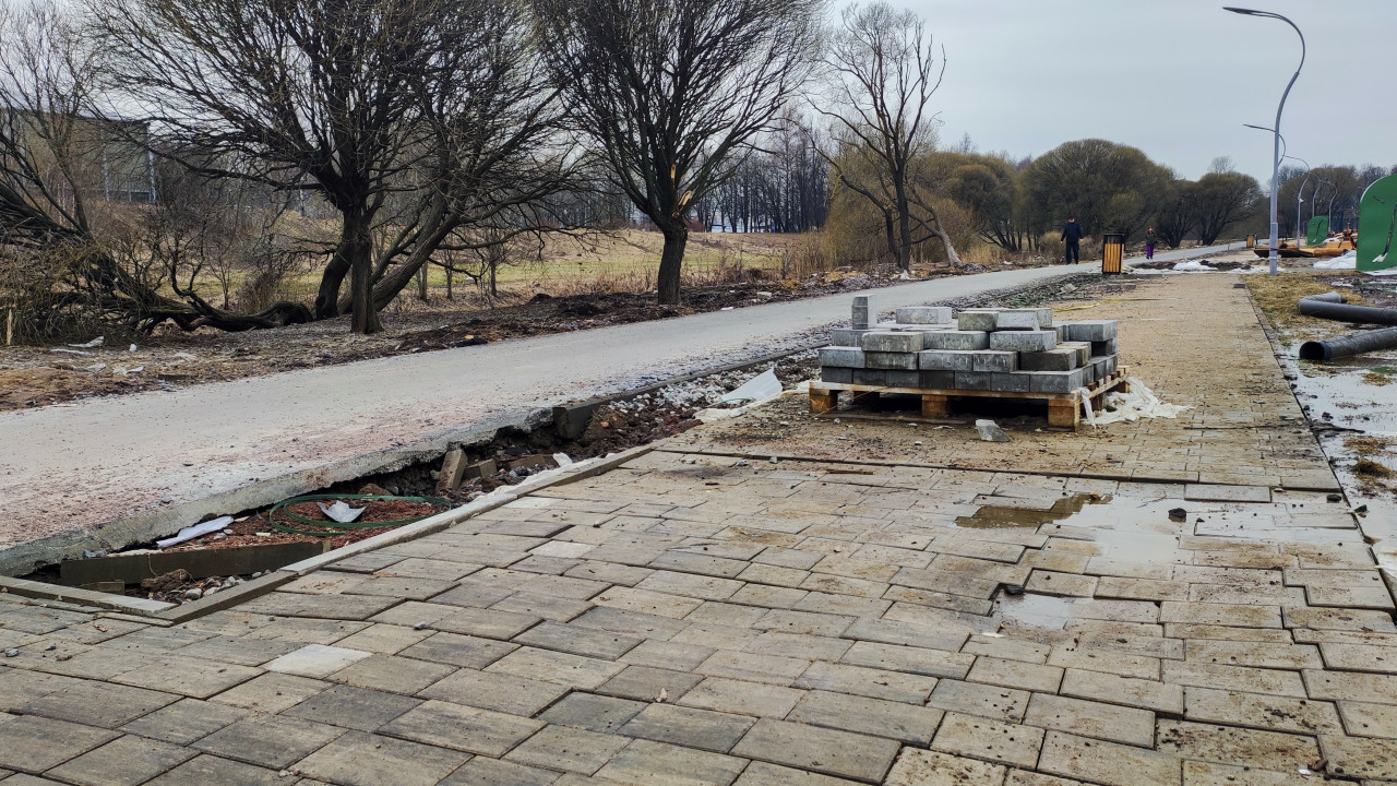 Фотография демонстрирует фрагмент пешеходной дорожки в парке, находящейся на реконструкции. На переднем плане видны уложенные бетонные плиты и поддоны с новыми блоками, рядом — размытый край тротуара и грунт. На заднем плане просматривается аллея с фонарями и пешеходами. Окружающие деревья без листвы указывают на раннюю весну или позднюю осень. Снимок отражает процесс благоустройства городской инфраструктуры и может использоваться для тем урбанистики, проектирования и муниципальных работ.