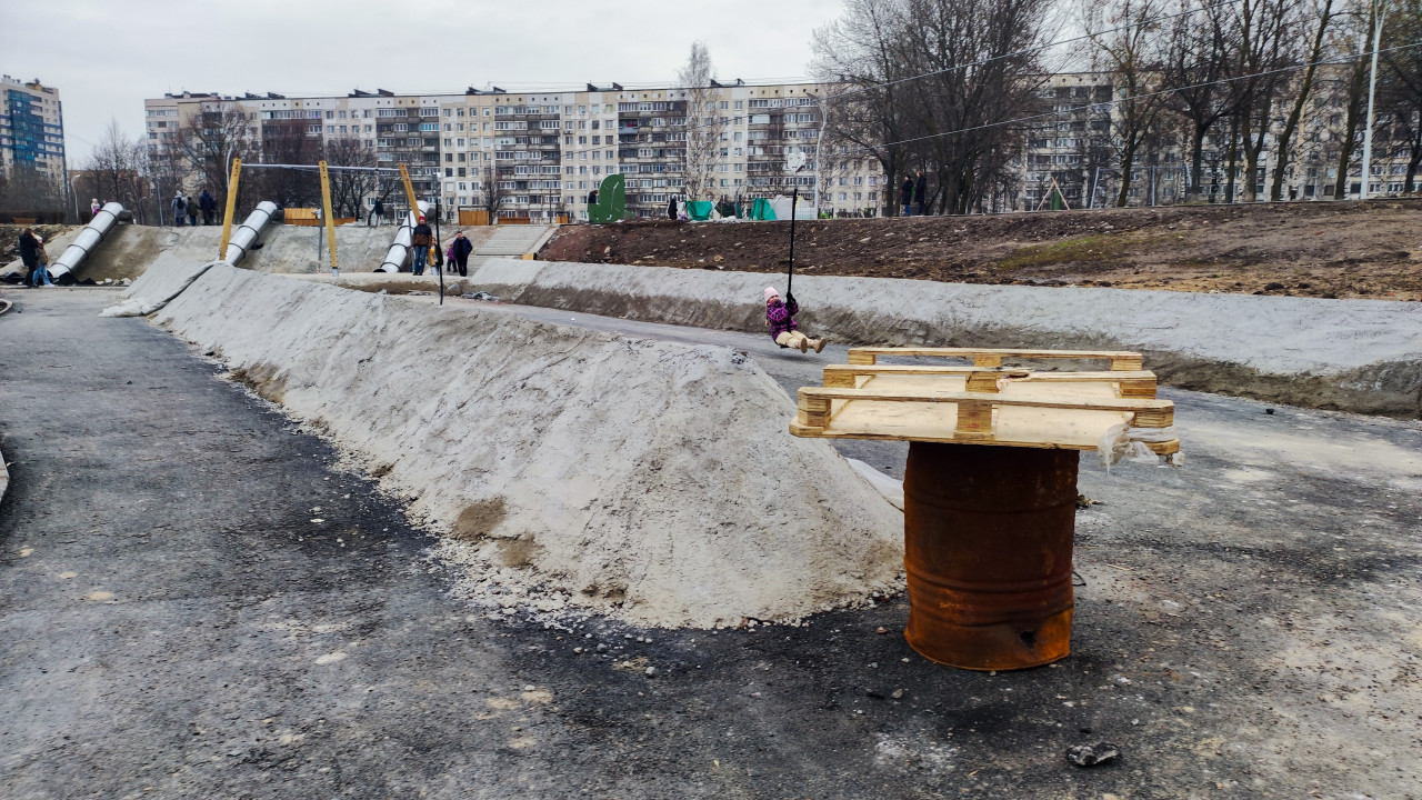 На фотографии запечатлён процесс благоустройства парковой зоны с детской площадкой, находящейся на этапе завершения работ. На переднем плане виден ржавый металлический барабан с деревянными досками, за ним — бетонные насыпи с подвесными тросами, по которым катаются дети. Вдали установлены металлические трубы горок и качели. На фоне расположены многоэтажные жилые дома типовой советской застройки. Сцена отражает урбанистическую реконструкцию общественных пространств. Снимок можно использовать для иллюстраций тем городского благоустройства и инфраструктурного развития.