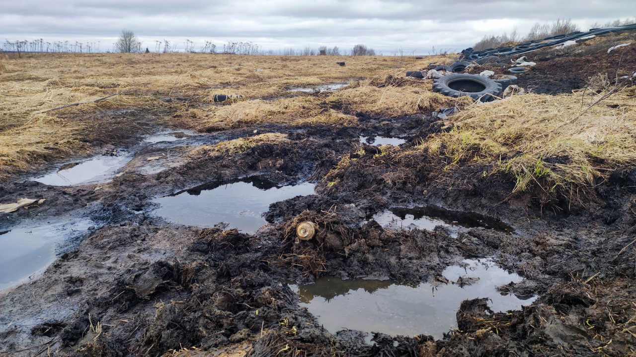 На снимке запечатлён фрагмент поля рядом с силосной ямой, частично видимой справа. В центре кадра — неровная влажная почва с множественными лужами и следами органического материала. На поверхности видна старая металлическая банка, а вдоль края участка — покрышки, удерживающие плёнку укрытия. Пасмурное небо и остатки сухой травы создают атмосферу межсезонья. Фото подходит для использования в темах об экологии, переработке отходов и фермерских технологиях.