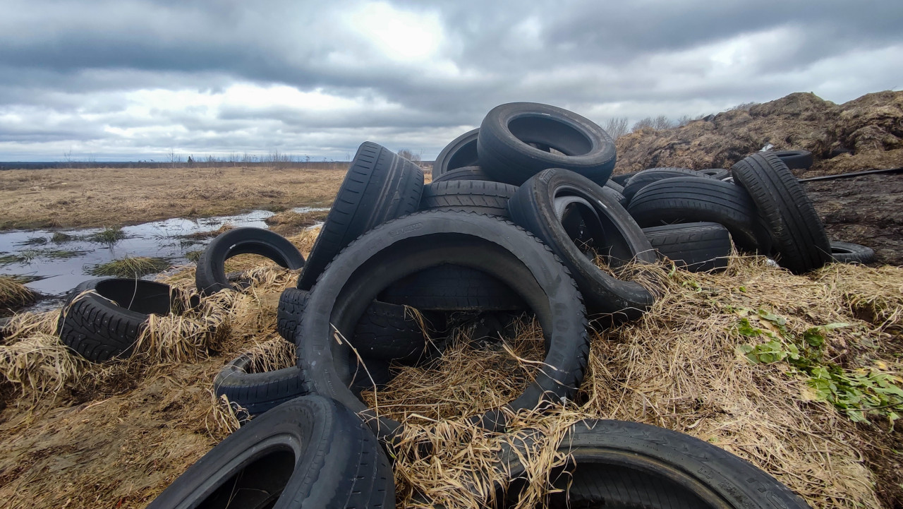 На снимке показано сельскохозяйственное хранилище с кучей шин, лежащих рядом с компостной или навозной массой. Эти шины применяются для утяжеления полиэтиленовой плёнки, используемой при силосовании кормов. Герметичное укрытие защищает массу от воздуха и осадков. Фото подходит для иллюстрации технологий кормозаготовки, экологии и повторного использования материалов.