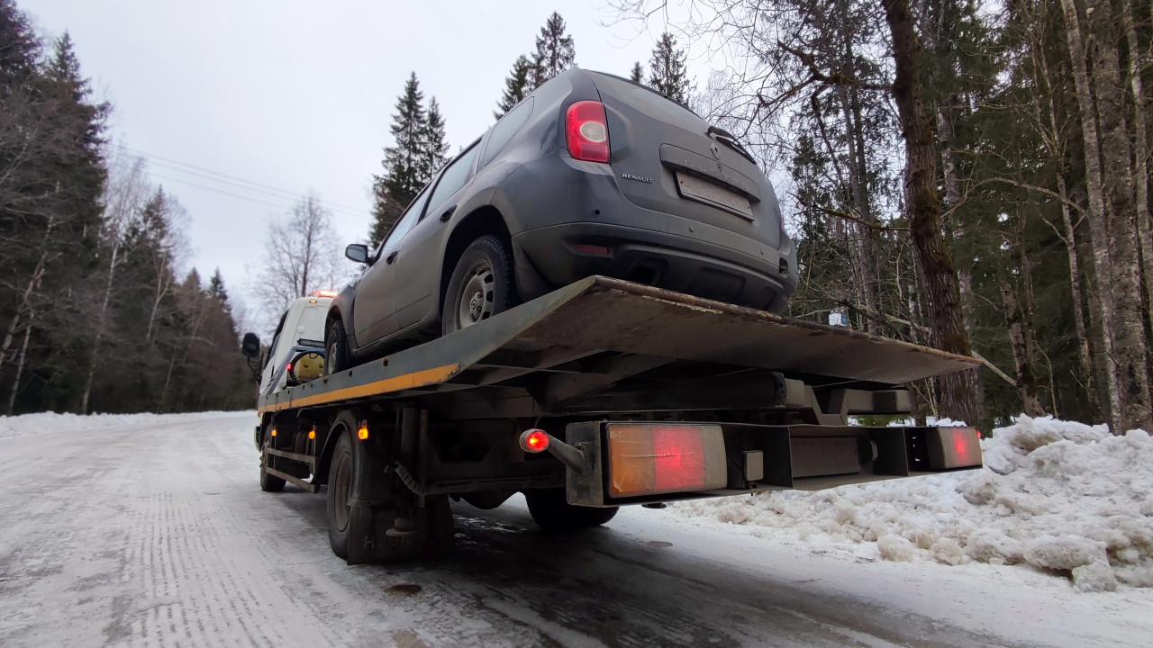 Внедорожник Renault Duster перевозится на эвакуаторе зимой
