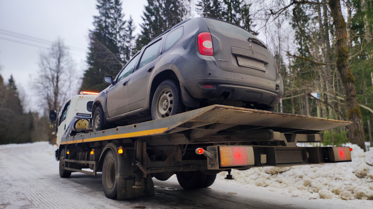 Внедорожник Renault Duster перевозится на эвакуаторе зимой