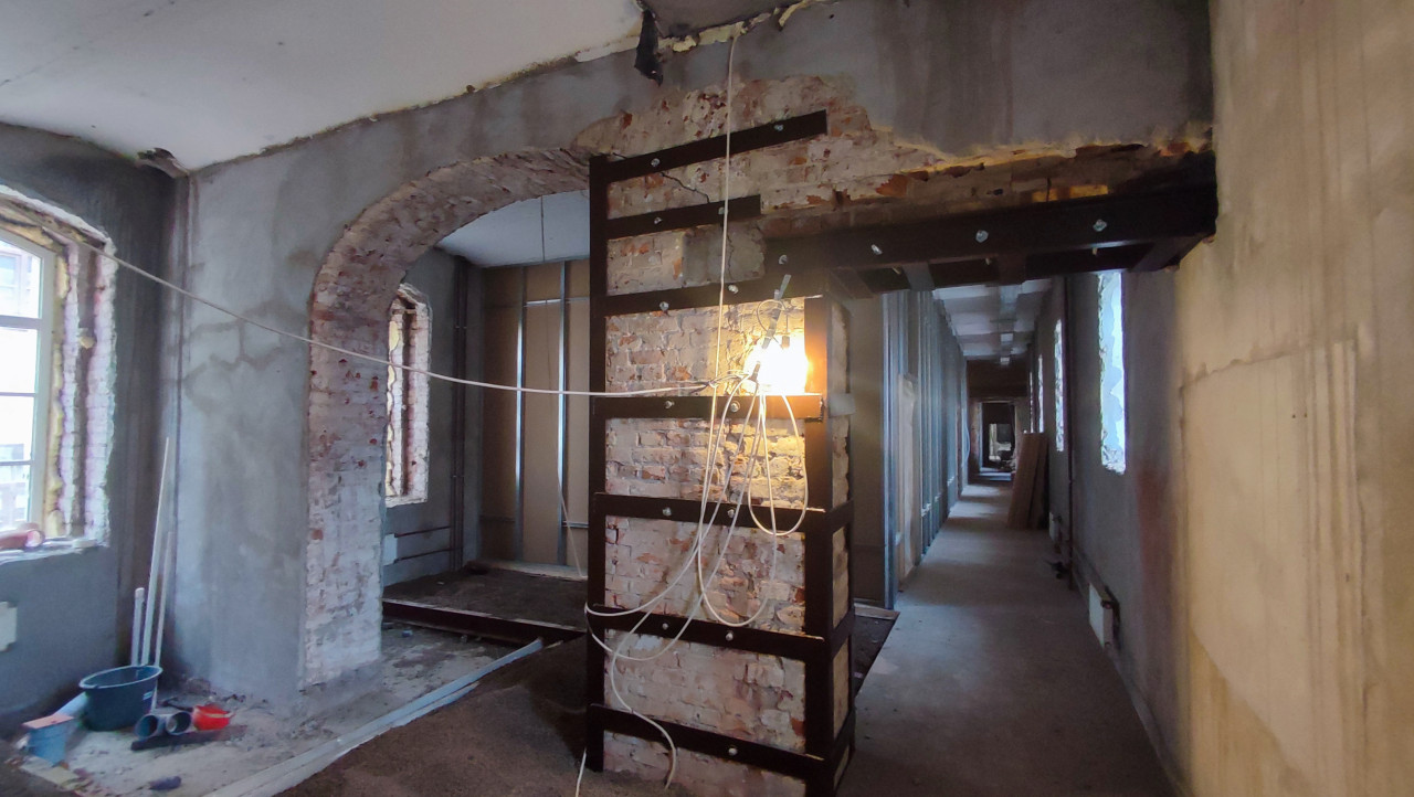 На фото показан процесс реставрации и усиления кирпичных стен и арочных проемов в старом здании с видимыми элементами кладки и временной электропроводкой. Используются металлические балки и анкерные крепления для укрепления несущей конструкции. Снимок сделан в помещении с высокими потолками и длинным коридором, характерным для дореволюционных построек конца XIX века. Фото подходит для иллюстрации строительных и реставрационных работ, архитектурного наследия и инженерных решений.