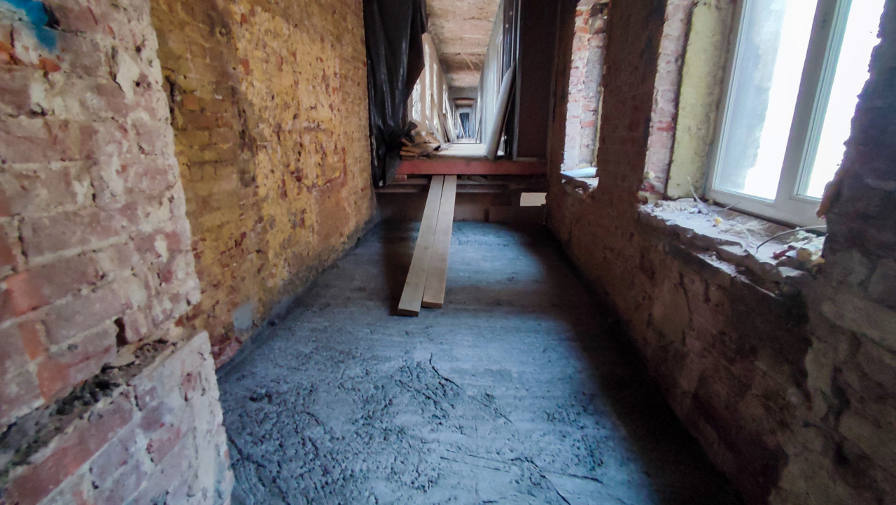 На снимке изображён узкий коридор с кирпичными стенами и окнами, частично восстановленными в ходе строительных работ. На полу виден свежий слой бетона и деревянные доски, уложенные для прохода. Свет проникает через окна с толстыми откосами, характерными для зданий конца XIX века. Фото отражает этап внутренней реставрации и реконструкции исторического сооружения, подходит для публикаций о восстановлении архитектурного наследия.