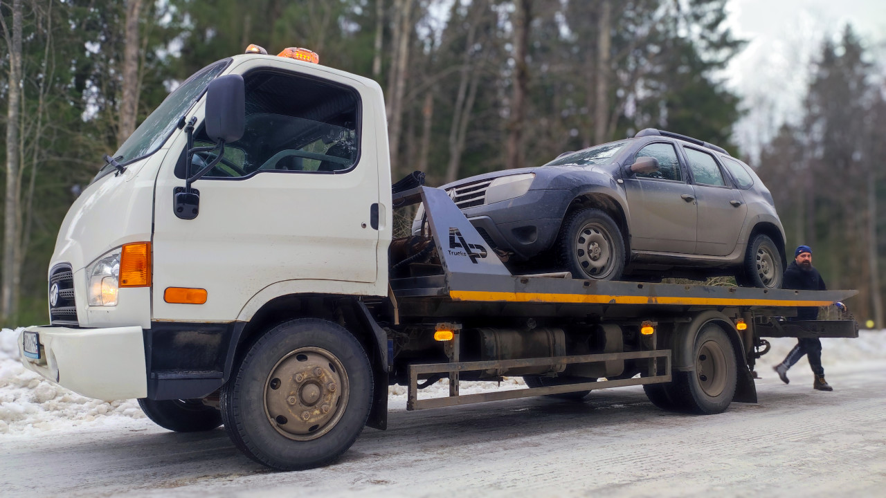 Эвакуатор Hyundai поднимает внедорожник Renault Duster на платформу