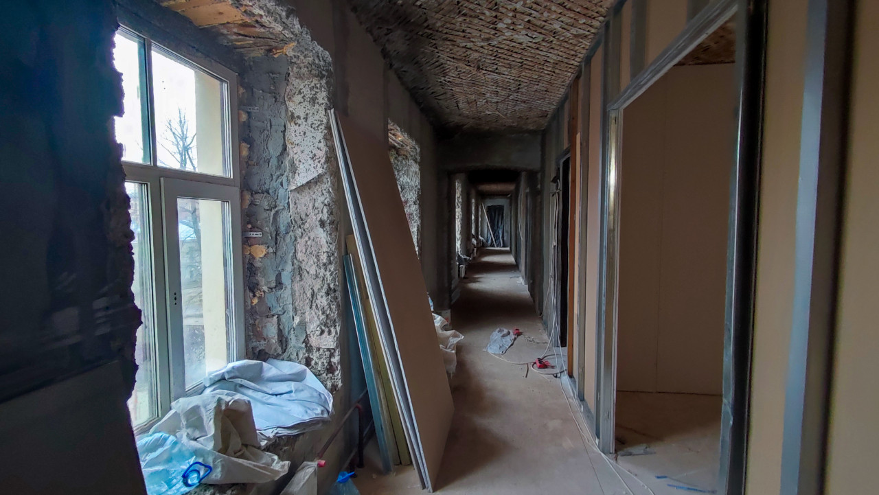 На фото изображён длинный коридор старого здания с частично открытой кирпичной кладкой и металлическими направляющими для стен. У окон видны строительные материалы, листы гипсокартона и инструменты. Потолок выполнен из драни, характерной для исторических построек. Сцена отражает процесс внутренней реставрации и может использоваться для иллюстрации архитектурных или инженерных проектов.