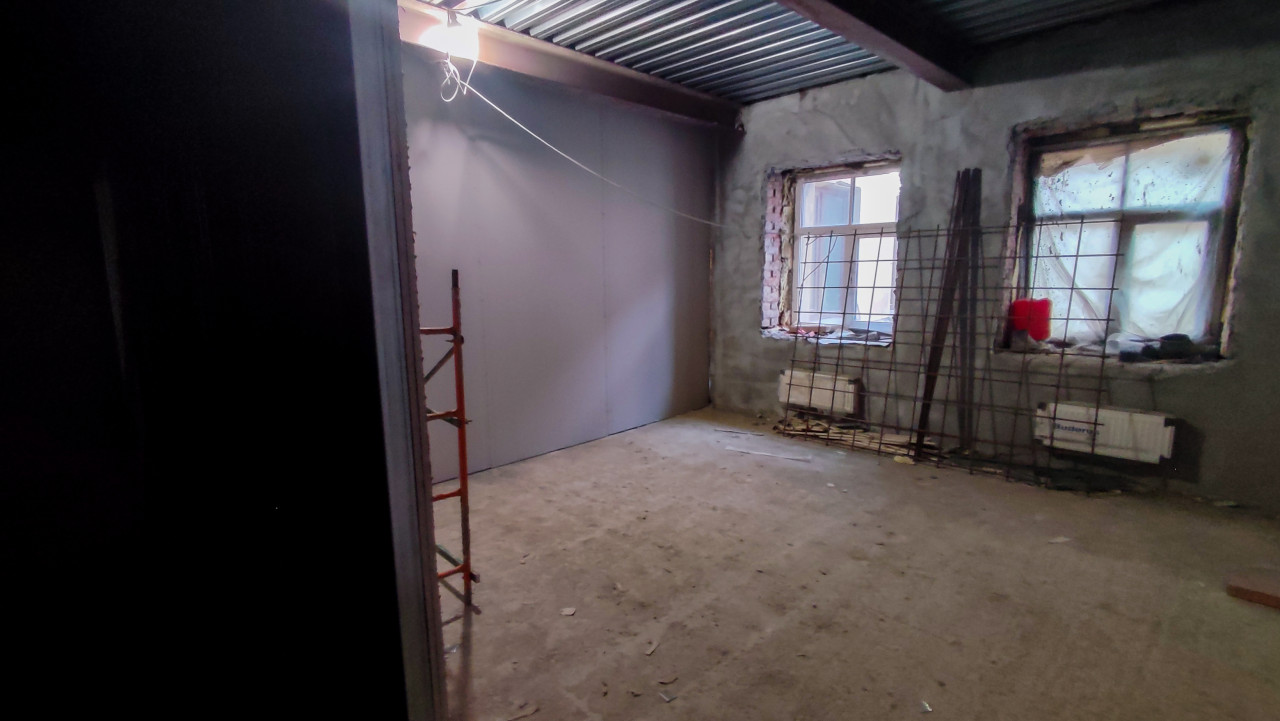 На фото показана комната с оштукатуренными стенами и металлическими элементами перекрытий. На полу — строительный мусор и инструменты, у стен установлены гипсокартонные панели. Через окна с частично восстановленными откосами поступает дневной свет. Объект представляет собой часть реставрируемого здания конца XIX — начала XX века. Снимок подходит для тем реконструкции, архитектурных работ и внутренней отделки.