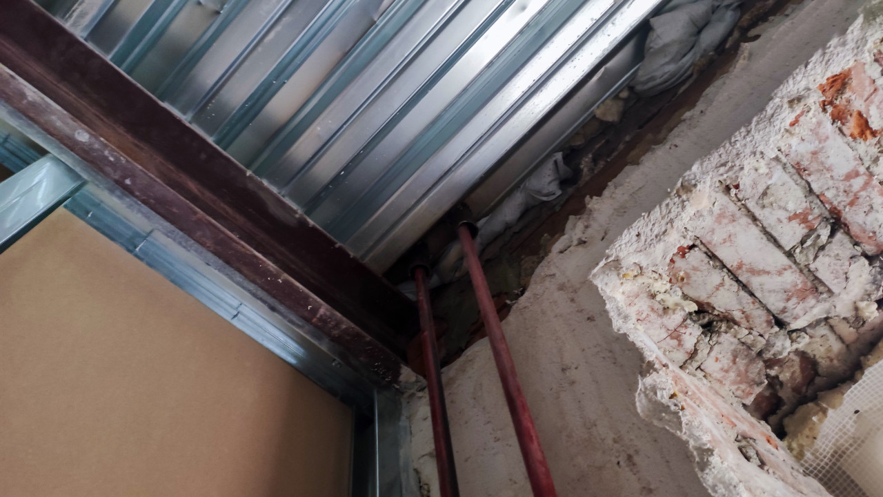 На фото изображены элементы внутренней конструкции старого здания: металлические перекрытия, балки и красная кирпичная кладка, частично покрытая штукатуркой. Видны проложенные инженерные трубы. Кадр отражает этап реконструкции или капитального ремонта исторического дома, типичного для архитектуры Санкт-Петербурга конца XIX века. Снимок подходит для иллюстрации тем, связанных с реставрацией, инженерными решениями и строительными технологиями.