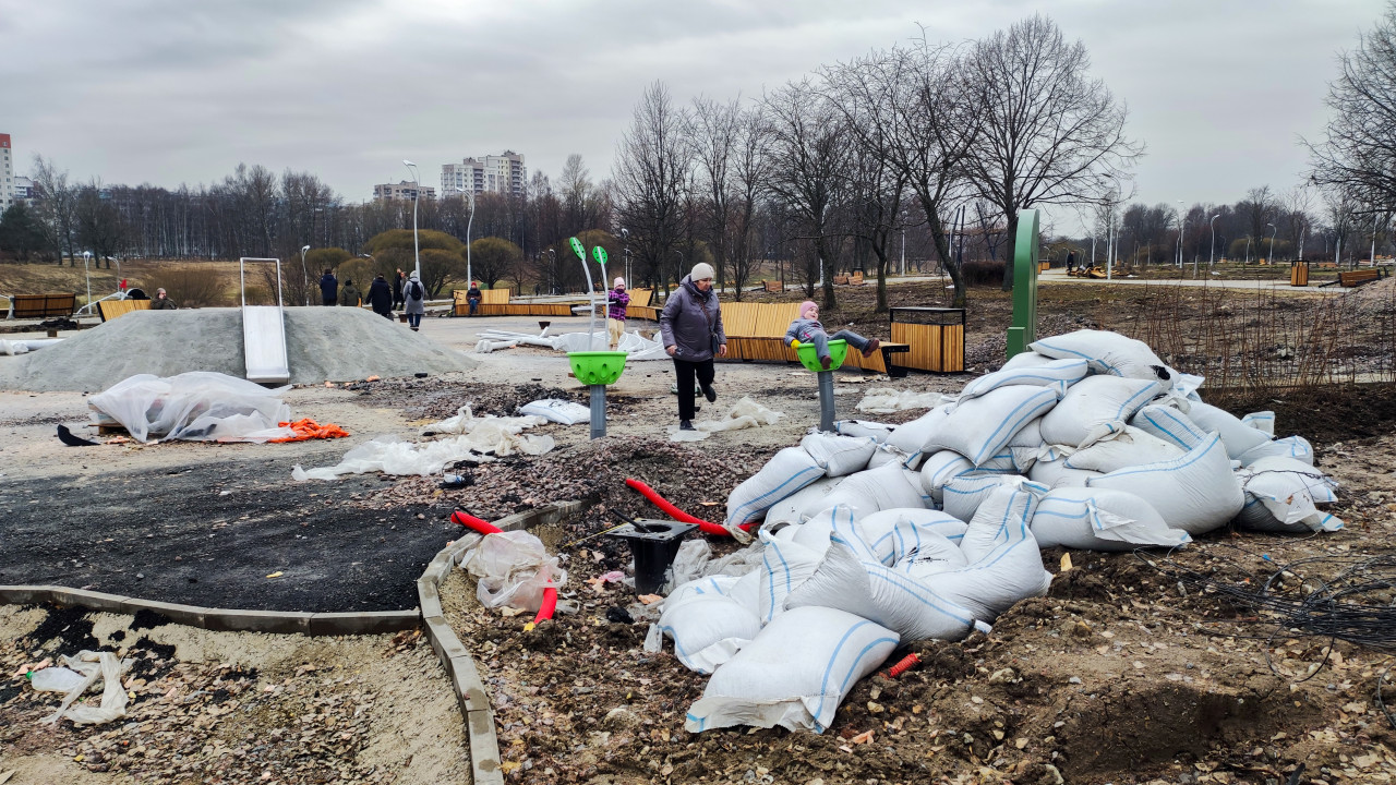 Фотография показывает часть благоустраиваемой детской площадки. На переднем плане лежат мешки со строительным материалом, песок и обломки асфальта. В центре видны установленные игровые элементы — вращающиеся чаши и декоративные конструкции. Вдали — пешеходы, фонари и аллеи парка. Снимок отражает процесс городского благоустройства и создания современной инфраструктуры отдыха. Используется в материалах об урбанистике и проектировании городских территорий.