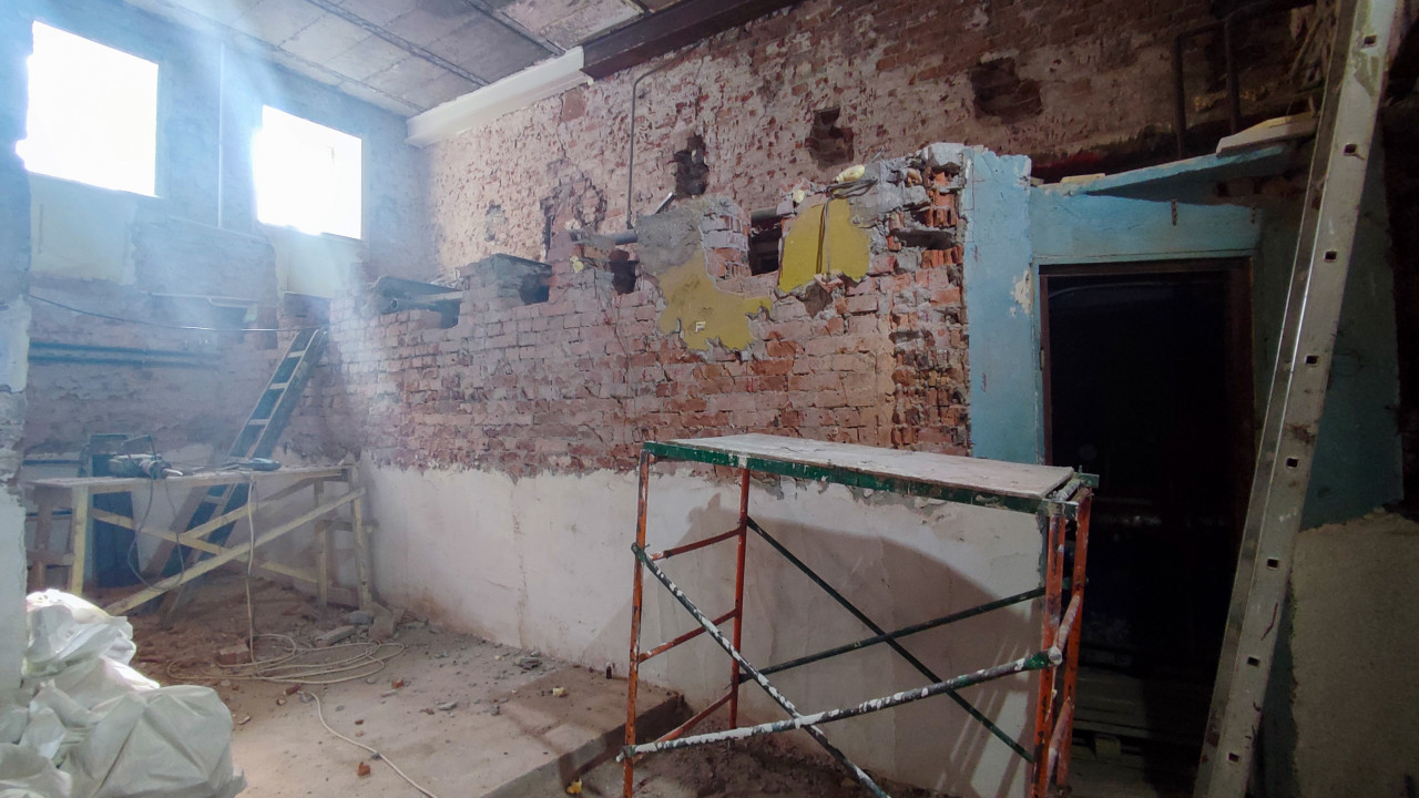 На снимке показана кирпичная стена с частично сохранившейся штукатуркой и следами старой отделки. В помещении находятся строительные леса, лестница, инструменты и обломки штукатурки. Сквозь верхние окна проникает дневной свет, освещая рабочую зону. Фотография отражает этап подготовки стен к реставрационным работам в историческом здании XIX–XX века. Снимок можно использовать в материалах о реставрации кирпичной кладки, сохранении архитектурного наследия и восстановлении старинных конструкций.