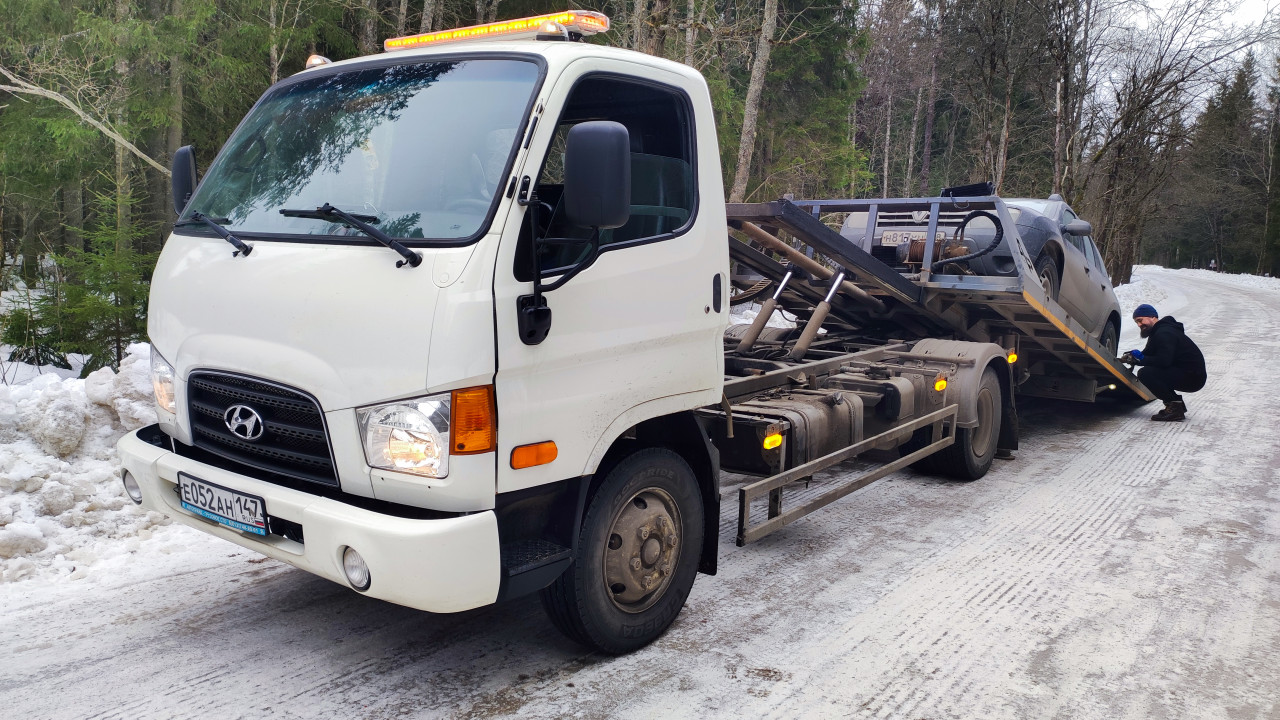 Работник эвакуаторной службы завершает погрузку автомобиля Renault Duster